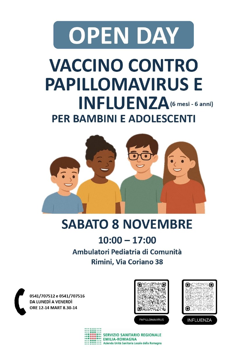 Dalle ore 10 alle 17, negli ambulatori di Pediatria della Comunità della sede Ausl del Colosseo (via Coriano 38, ingresso scala E), sarà infatti possibile effettuare a libero accesso, senza alcuna prenotazione o appuntamento, le vaccinazioni contro Papillomavirus e influenza, con le seguenti modalità.