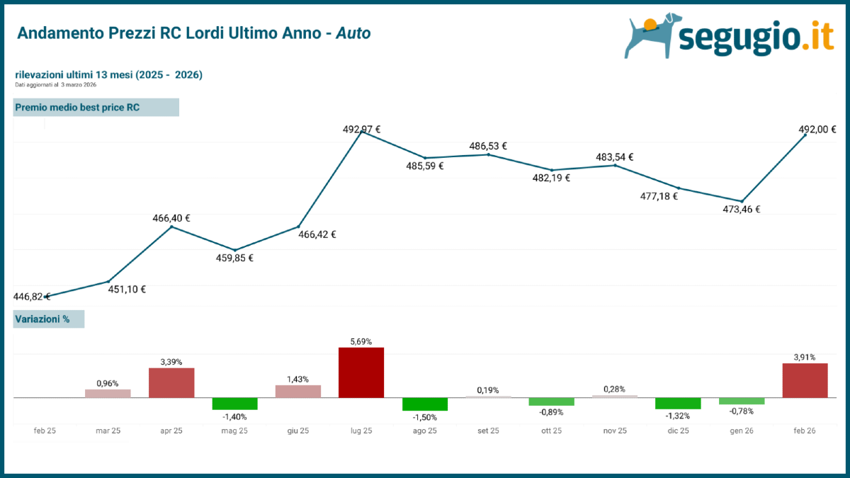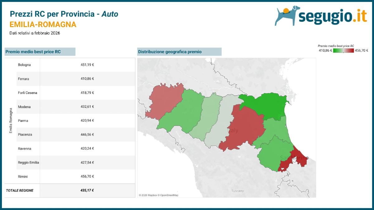 A febbraio 2026 il costo medio dell’RC Auto in Italia raggiunge i 492 euro, in aumento del +10,1% su base annua. Rispetto a gennaio si registra un ulteriore incremento del +3,9%, segnale di una nuova possibile fase di rialzo. Il dato si colloca tra i più alti dell’ultimo anno, secondo solo al picco di luglio 2025. In Emilia-Romagna il prezzo medio è più contenuto, pari a 435,17 euro, ma comunque in crescita del +5,4%. Nonostante il valore sotto la media nazionale, anche in regione si conferma una tendenza al rincaro. Oltre il 50% degli automobilisti emiliano-romagnoli sceglie l’assistenza stradale come garanzia accessoria. Più limitata invece la diffusione della copertura per eventi naturali, scelta solo dall’8,1% degli utenti.