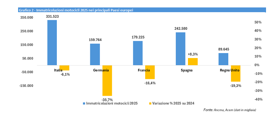 Il calo è in parte spiegato dal forte incremento delle immatricolazioni registrato a fine 2024, legato all’entrata in vigore, dal 1° gennaio 2025, della normativa europea Euro 5+. Una dinamica che si riflette anche nei principali mercati europei, seppur con intensità diverse. La Germania registra la contrazione più marcata su base annua (-35,7%), con circa 160 mila veicoli immatricolati. Più contenuti i cali di Regno Unito (-19,3%) e Francia (-16,4%). In controtendenza la Spagna, unica nazione in crescita: nel 2025 le immatricolazioni hanno superato le 242 mila unità, segnando un aumento del +8,3% su base annua. Nonostante la crescita spagnola, l’Italia si conferma il primo mercato europeo per numero di motocicli immatricolati