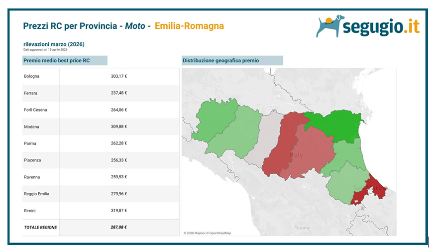 In Emilia-Romagna, a marzo 2026 il prezzo per l’RC Moto ha toccato i 287,08 € in media, per un aumento anno su anno pari al +13,2%, dato leggermente inferiore rispetto alla media in Italia. Guardando al dettaglio provinciale, in quella di Rimini i prezzi sono i più alti della regione, con una media di 287,08 €, mentre invece quella di Ferrara è la meno cara, con una media registrata di 237,48 €. La provincia di Rimini è anche quella dove si registra il rincaro maggiore, con un aumento del prezzo medio RC moto del +15,8% anno su anno, seguita a breve distanza da quella di Bologna, dove l’aumento è pari al +14,7% per un prezzo medio di 303,17 €. Parma, invece, è la provincia della regione dove si osserva l’aumento più contenuto dei prezzi: +3,0% anno su anno per una media di 262,28 €.