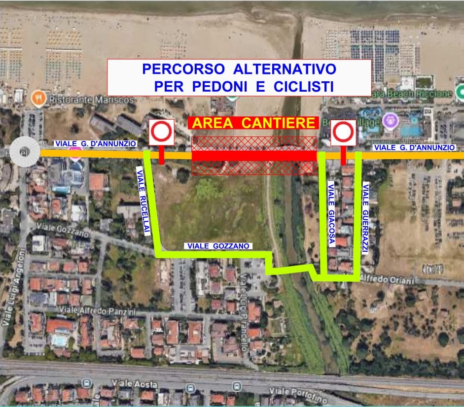 Anche la mobilità dolce subisce variazioni: pedoni e ciclisti potranno bypassare il cantiere utilizzando l’asse viale Rucellai - viale Giacosa - viale Guerrazzi (transitando sul ponte di legno di viale Gozzano) per chi procede verso sud, e il percorso inverso per chi si dirige verso Rimini.