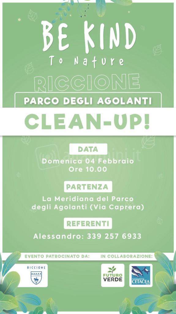 Be Kind to Nature assieme a Futuro Verde e Fondazione Cetacea, con il patrocinio del Comune di Riccione, promuovono l’evento “Clean-Up Riccione”, un’iniziativa di pulizia del Parco degli Agolanti, che si terrà domenica 4 febbraio a partire dalle 10 sino alle ore 12.
