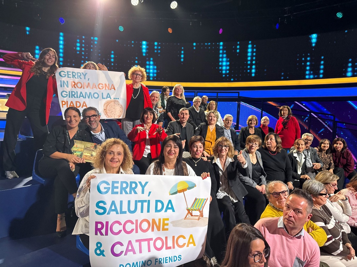 La comitiva riccionese, che ha preso parte il 23 dicembre alla registrazione delle puntate in onda da ieri fino a mercoledì 14 gennaio, ha dato vita a una vera e propria “spedizione romagnola” nel cuore della televisione italiana. Una volta in studio, i romagnoli non sono passati inosservati: tra cartelli simpatici e slogan giocosi, hanno salutato il conduttore, la showgirl Samira e tutto il pubblico, facendo eco al celebre motto della trasmissione: “Gira la ruota”. Per i riccionesi lo slogan si è trasformato infatti in qualcosa di decisamente più nostrano: “In Romagna giriamo la piada”. Il cartello ha strappato sorrisi e risate a Gerry Scotti e a tutto lo studio.