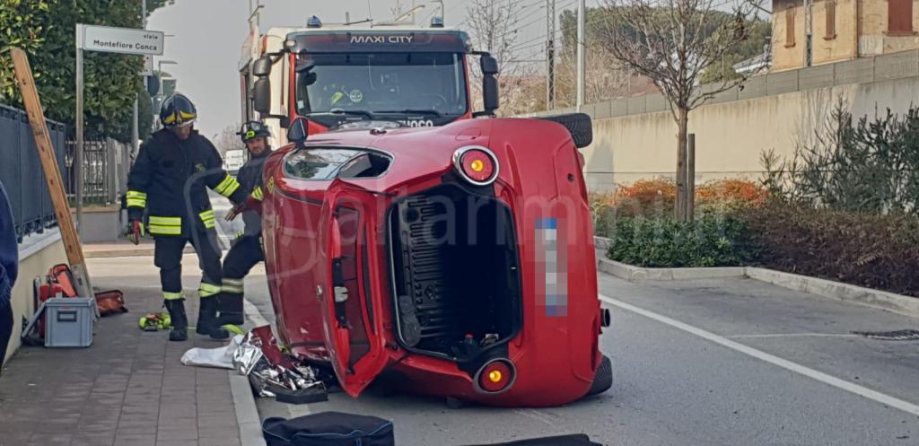 Riccione, donna perde il controllo, urta un’auto e si ribalta. Estratta dai vigili del fuoco