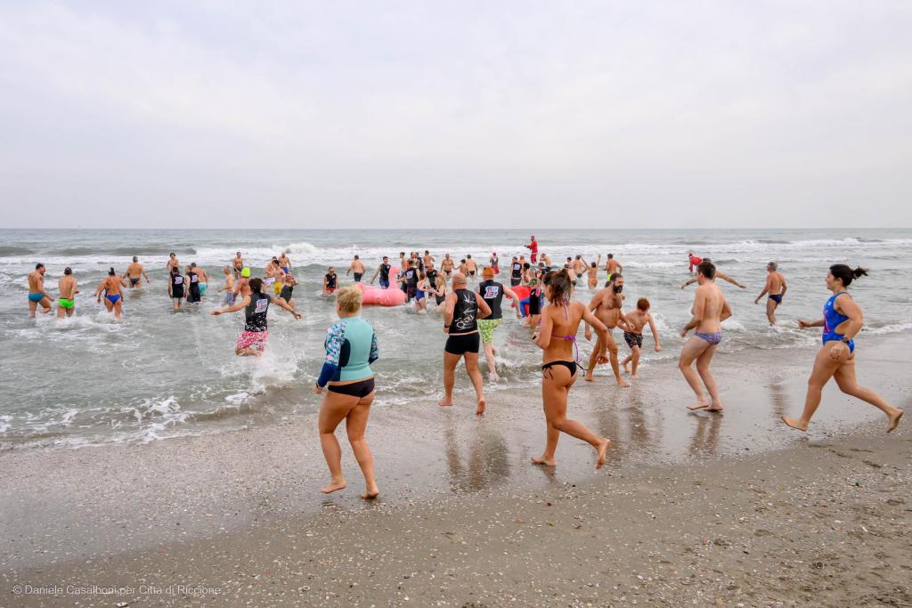 Alla fine erano oltre cento le persone, tra riccionesi e ospiti della città, che si sono tuffate in mare: un rito collettivo e coinvolgente che si ripete da tantissimi anni. Un augurio per il nuovo anno, un gesto scaramantico che dischiude alla prossima bella stagione carica di aspettative e sogni, semplicemente una festa della comunità allargata di Riccione, oltre a una dedica d’amore a quel mare che è essenza vitale.