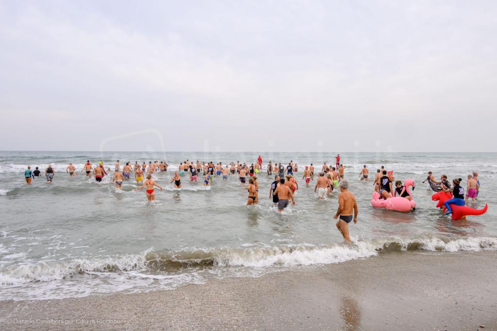 Alla fine erano oltre cento le persone, tra riccionesi e ospiti della città, che si sono tuffate in mare: un rito collettivo e coinvolgente che si ripete da tantissimi anni. Un augurio per il nuovo anno, un gesto scaramantico che dischiude alla prossima bella stagione carica di aspettative e sogni, semplicemente una festa della comunità allargata di Riccione, oltre a una dedica d’amore a quel mare che è essenza vitale.