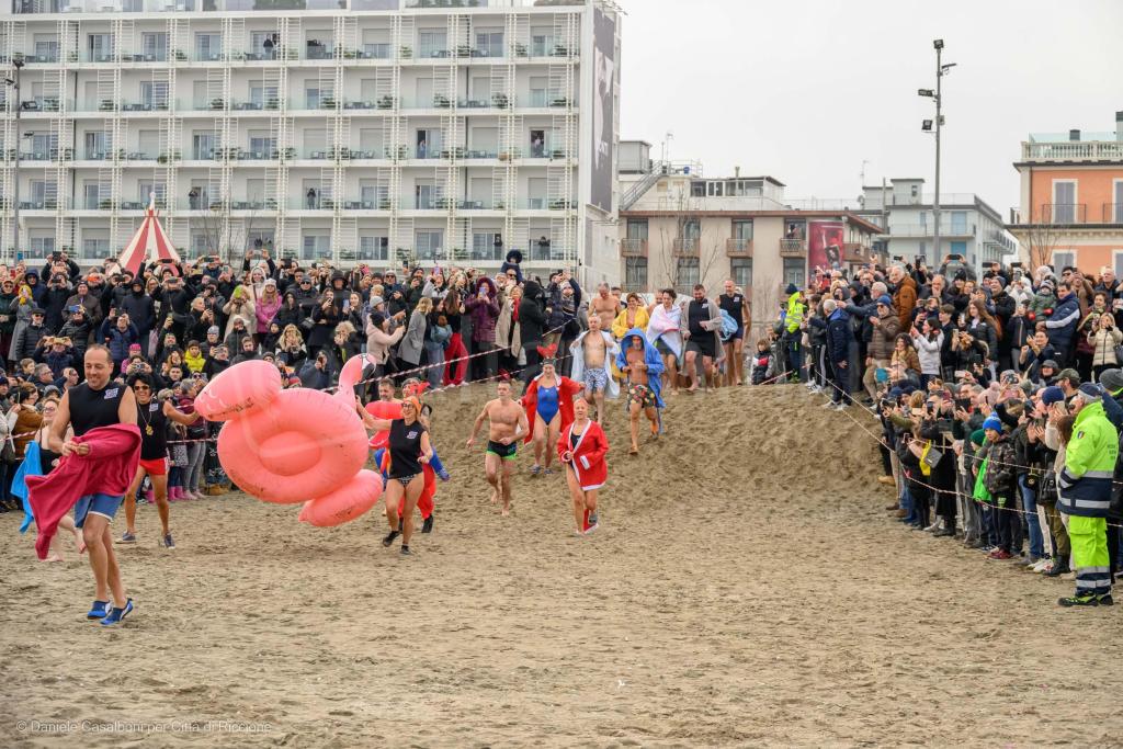 Alla fine erano oltre cento le persone, tra riccionesi e ospiti della città, che si sono tuffate in mare: un rito collettivo e coinvolgente che si ripete da tantissimi anni. Un augurio per il nuovo anno, un gesto scaramantico che dischiude alla prossima bella stagione carica di aspettative e sogni, semplicemente una festa della comunità allargata di Riccione, oltre a una dedica d’amore a quel mare che è essenza vitale.