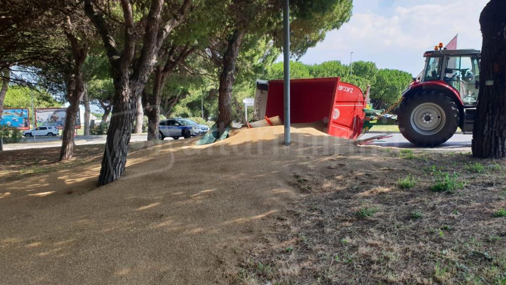 Attorno alle ore 16, il rimorchio di un trattore diretto verso Rimini, all’interno della rotonda delle vele a Riccione ha perso stabilità ribaltandosi e facendo fuoriuscire una montagna di semi di grano sul parco adiacente la strada. Sul posto sono intervenuti prima la polizia Locale e la gru per sollevare i carichi eccezzionali.