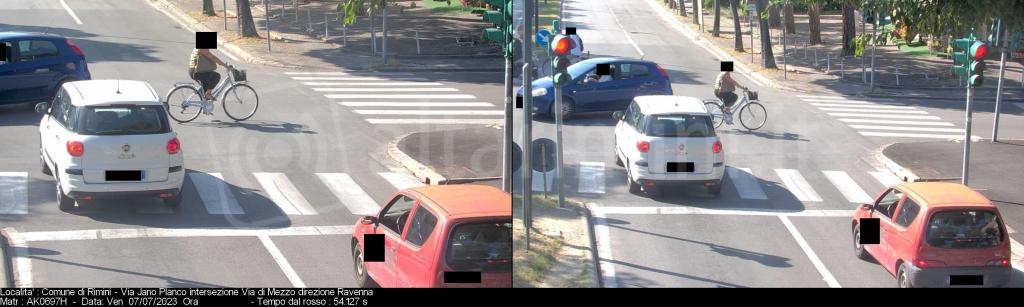 Semaforo di via Jano Planco, intersezione con via di Mezzo: nonostante il semaforo emetta luce rossa, un’autovettura, incurante dell’obbligo di fermarsi, procede dritto in direzione Ravenna, evitando solo per un soffio una bicicletta condotta da una signora, che stava attraversando l’incarico nell’altra direzione. Stessa dinamica, sempre nella prima settimana del mese di luglio, questa volta all’intersezione tra la Statele 72 (Rimini-San Marino) e via della Gazzella: un’altra autovettura, che procede in direzione monte, oltrepassa in velocità il semaforo, omettendo di rispettare la luce rossa, che in quel momento stava emettendo l’impianto semaforico.