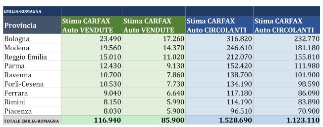 A livello provinciale, è Bologna a guidare la classifica emiliano-romagnola, con una stima di circa 23.500 veicoli venduti con almeno un fattore di rischio e circa 17.300 con una storia di danni documentata. Sul fronte del circolante, si stimano circa 317.000 auto con almeno un rischio e quasi 233.000 con danni. Segue Modena, con quasi 19.600 veicoli venduti a rischio e circa 14.400 con danni; nel circolante, circa 247.000 auto a rischio e circa 181.000 con danni. Al terzo posto Reggio Emilia, con circa 15.000 auto vendute a rischio e circa 11.000 con danni; nel circolante, circa 212.000 vetture a rischio e circa 156.000 con danni.
