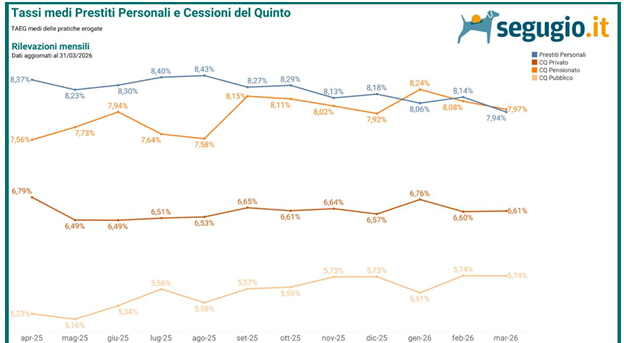 Nel primo trimestre del 2026 prosegue il trend di calo dei tassi d’interesse iniziato lo scorso anno per quanto riguarda il mercato dei finanziamenti in Italia, soprattutto per i prestiti personali. Secondo i dati dell’Osservatorio Finanziamenti di Segugio.it, a marzo il TAEG medio delle pratiche erogate per i prestiti personali è sceso sotto l’8,00%, subendo un calo di 20 punti base rispetto al mese precedente e passando dunque dall’8,14% di febbraio al 7,94%. Guardando ai tassi di interesse delle cessioni del quinto per dipendenti privati - che offrono condizioni ben più convenienti rispetto ai prestiti personali in virtù delle garanzie più solide offerte alle finanziarie – il TAEG medio si mantiene stabile al 6,61%, così come accade per le cessioni del quinto per dipendenti pubblici, che si fermano a una media del 5,74% anche a marzo. Per quanto riguarda le cessioni del quinto destinate ai pensionati si osserva invece un lieve calo di circa 10 punti base, con il TAEG medio che dall’8,08% di febbraio è sceso fino al 7,97% registrato nel mese appena concluso.