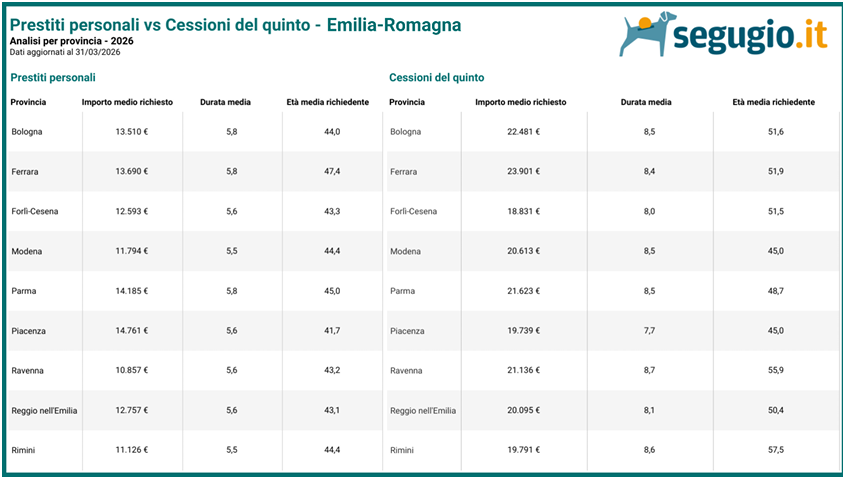 Piacenza la provincia dove le somme richieste sono più alte Secondo i dati dell’Osservatorio di Segugio.it, in Emilia-Romagna in cima alle finalità di finanziamento più popolari nel primo trimestre del 2026 si trova la liquidità, che assorbe il 29,8% del totale delle richieste. In seconda posizione c’è il 1 consolidamento con il 23,5 % delle domande, mentre sul terzo gradino del podio troviamo i finanziamenti finalizzati all’acquisto di un’auto usata, che assorbono oltre un quinto delle richieste nei primi 3 mesi di quest’anno (21,4% del mix). Per quanto riguarda gli importi richiesti per prestiti personali nel corso del 2026 finora, nella regione il dato tocca i 12.600 € in media, con il consolidamento che si conferma la finalità per la quale si chiedono le somme maggiori (18.300 € in media). In Emilia-Romagna la provincia dove si richiedono le somme maggiori in questo primo trimestre del 2026 è quella di Piacenza, con la media che si attesta su 14.761 €, mentre al contrario in quella di Ravenna si richiedono gli importi minori della regione: 10.857 € in media. Guardando alla durata media dei finanziamenti, i più lunghi vengono richiesti a Bologna, Ferrara e Parma (5 anni e 10 mesi in media), mentre i più brevi nelle province di Modena e Rimini (5 anni e 6 mesi). Infine, i richiedenti di prestiti personali più giovani nel primo trimestre del 2026 si trovano a Piacenza (41 anni e 8 mesi in media), mentre l’età più elevata si registra a Ferrara (47 anni e 5 mesi).