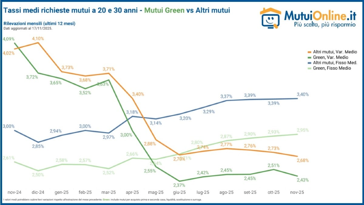 “I mutui green rappresentano un’opportunità per molti consumatori di ottenere condizioni di finanziamento molto competitive, soprattutto alla luce del recente adeguamento della direttiva europea” - spiega Matteo Favaro, COO & Managing Director Financial Product di MutuiOnline.it - “Ora questi mutui possono essere concessi anche a immobili in classe energetica C o D, a differenza di quanto accadeva in passato quando dovevano appartenere alla classe A o B, e i nuovi criteri includono la valutazione di altri fattori come l’anno di costruzione, la zona climatica dove si trova la casa e dell’indice di prestazione energetica dell’edificio. Il sistema aggiornato di valutazione dell’immobile permette di allargare la quota di case italiane che rientrano tra quelle acquistabili attraverso un finanziamento “verde”, anche se al momento solo un numero limitato di istituti di credito ha adottato le nuove direttive, includendo anche le case di classe C o facendo direttamente riferimento al PED (indice di prestazione energetica).”