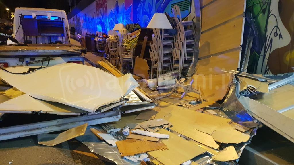 Sbatte sotto il ponte: divani, sedie e tavolini in strada. Lo schianto è impressionante