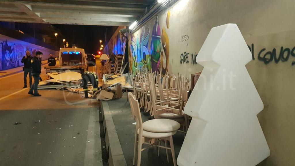 Sbatte sotto il ponte: divani, sedie e tavolini in strada. Lo schianto è impressionante
