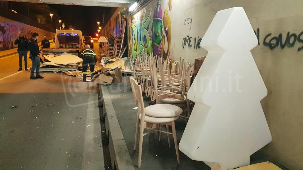 Sbatte sotto il ponte: divani, sedie e tavolini in strada. Lo schianto è impressionante