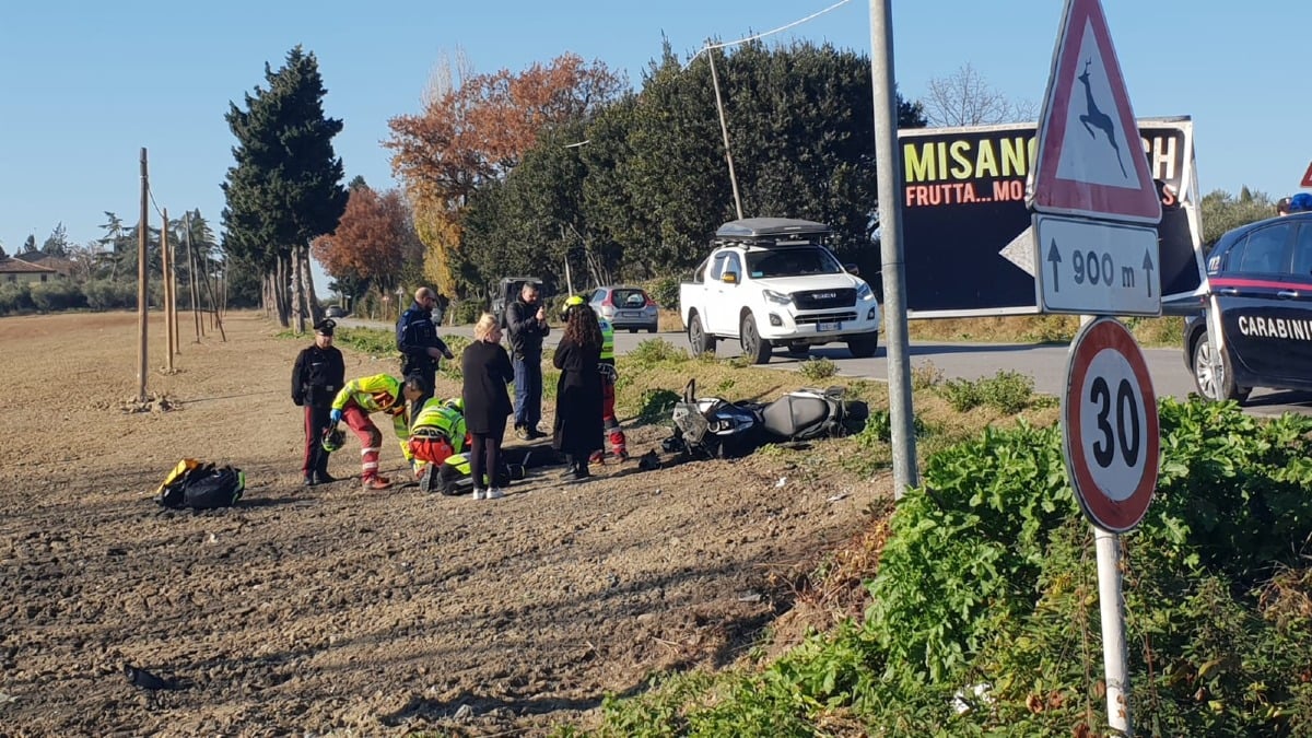 L’impatto è stato particolarmente violento: il motociclista è stato sbalzato per diversi metri, andando a urtare prima un cartello pubblicitario e finendo poi in un campo adiacente alla carreggiata.