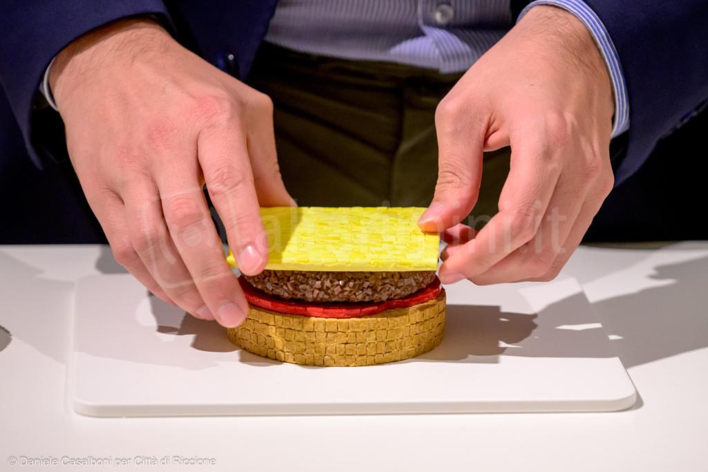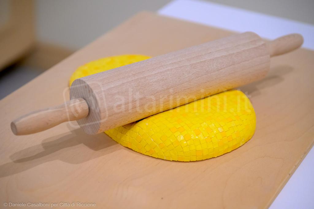 La mostra si sviluppa in cinque sale di Villa Franceschi, ognuna delle quali propone una tematica differente identificata con un hashtag. Dalla sala #Maestro, dedicata al leggendario Pellegrino Artusi e a “Impasto”, opera musiva della serie “Memorie di Romagna”, alla sala #Sano con oggetti comuni presenti nelle cucine casalinghe alla sala #Foodporn che raccoglie una delle opere più note dell’artista: MyPanino del 2013 che permette al visitatore di creare la propria opera d’arte con gli ingredienti forniti in mosaico, fotografarla e condividerla sul web. L’opera, oltre ad offrire un nuovo rapporto con la forma d’arte che amplia il proprio raggio d’azione fino allo spazio indefinito del web, pone l’attenzione sul fenomeno globale del Foodstagram in cui il cibo non è energia per il corpo bensì la sua rappresentazione mediatica. La quarta sala è dedicata a #Futuro che indaga le tematiche connesse all’impatto dell’uomo sull’ambiente. Termina il percorso la sala #Memoria con l’opera “Cappelletti”, altra opera straordinaria del ciclo “Memorie di Romagna”, in cui l’artista si interroga sul rapporto tra tradizione e grande distribuzione. A “rimpastare” le tante emozioni del visitatore alla fine del percorso troviamo Olga, la sfoglina romagnola, che ci riporta all’essenza della tradizione culinaria nostrana.