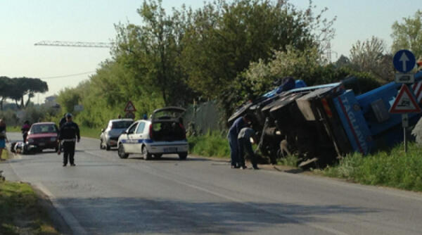 Incidente choc in via Coriano camion con gru si ribalta: un ferito