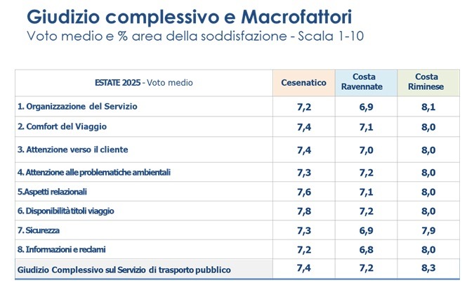 Nonostante il trasporto pubblico locale, a livello nazionale, stia ancora affrontando gli effetti derivanti da pandemia, crisi energetica ed emergenza autisti, nei tre bacini il giudizio complessivo degli utenti rimane stabilmente su livelli medio-alti, con dati particolarmente positivi nella costa riminese.