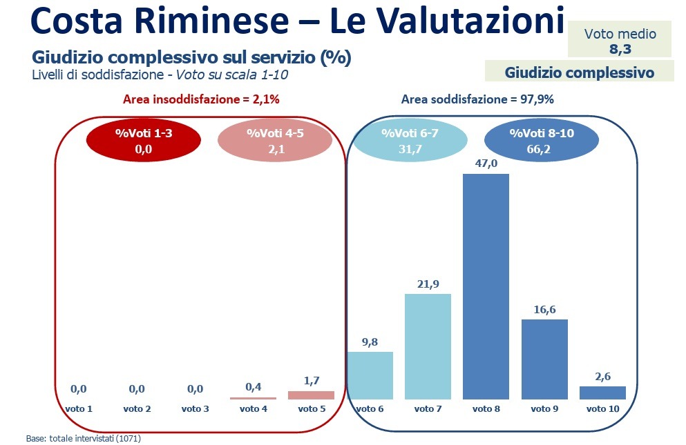 La soddisfazione degli utenti è straordinariamente alta e diffusa su tutto il territorio: a Cesenatico quasi 9 persone su 10 (98%) hanno dato un voto almeno sufficiente, nel Riminese la percentuale arriva al 97,9%, e nel Ravennate-Cervese al 94,8%.
