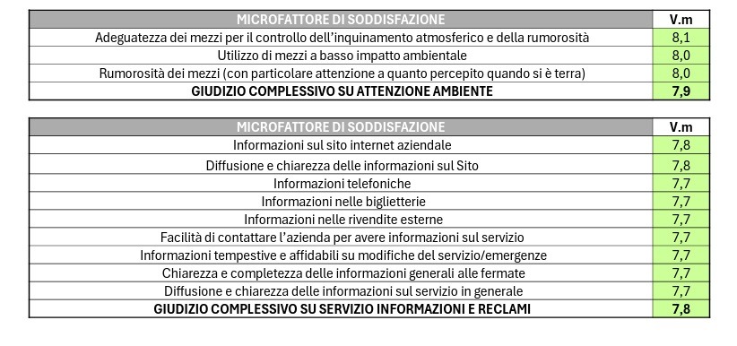 Le valutazioni hanno riguardato otto macro fattori: organizzazione del servizio, comfort di viaggio, attenzione al cliente, attenzione alle tematiche ambientali, aspetti relazionali, disponibilità dei titoli di viaggio, sicurezza, informazioni e gestione dei reclami.