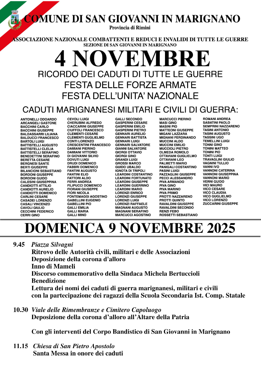 Le celebrazioni avranno inizio alle ore 9.45 in Piazza Silvagni, dove le autorità civili e militari si riuniranno presso il Monumento ai Caduti per la deposizione della corona d’alloro. Seguiranno l’intervento della Sindaca Michela Bertuccioli, l’accompagnamento del Corpo Bandistico e il contributo degli studenti della scuola secondaria dell’Istituto Comprensivo Statale, che proporranno letture e riflessioni dedicate ai valori della pace, della memoria e dell’unità.