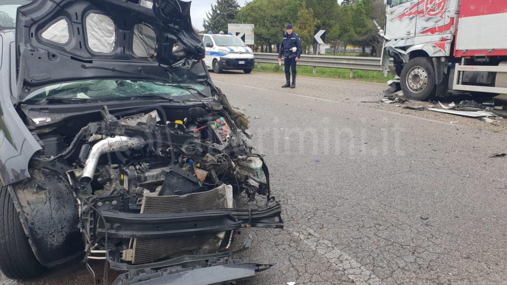 Violento frontale tra auto e tir: 50enne in gravi condizioni. Chiusa via Tolemaide - Le immagini dell'incidente in via Tolemaide, Rimini