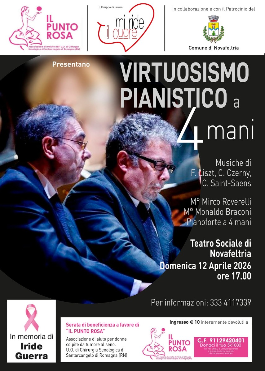 "Virtuosismo pianistico a 4 mani" è il titolo del concerto che si terrà domenica 12 aprile alle 17 al Teatro Sociale di Novafeltria. L'appuntamento, organizzato dal Punto Rosa e dal Gruppo di lavoro Mi ride il cuore, in collaborazione e patrocinio con il Comune di Novafeltria, prevede l'esecuzione di musiche di Liszt, Czerny, Saint-Sanes. Al pianoforte i Maestri Mirco Roverelli e Monaldo Braconi. L'appuntamento, in memoria di Iride Guerra, vuole sostenere Il punto Rosa di Santarcangelo, associazione di aiuto per donne colpite da tumore al seno.